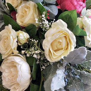 Jamaica entrusted us to create ten silk floral centrepieces with white roses, an alternating smattering of pink roses for a pop of colour and silk and fresh green foliage for the rectangle guest tables, two long and narrow centrepieces for extra long guest tables, the Sweetheart Table centrepiece and Cocktail table centrepiece. We supplied white table numbers and gold mercury candle holders for all tables.